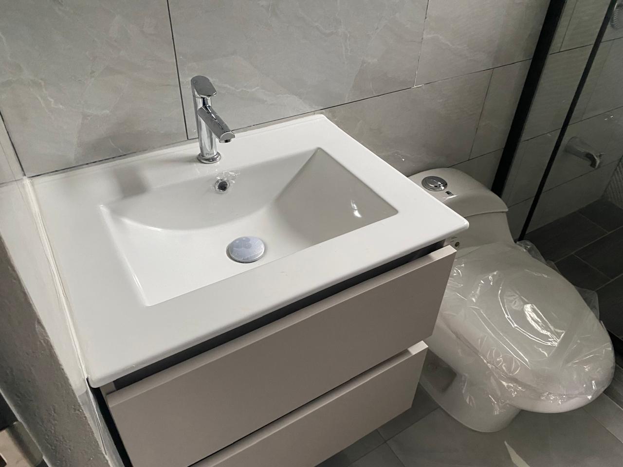 – Cocina con fregadero y cachera de acero inoxidable y su respectivo mueble moderno y con fino acabado